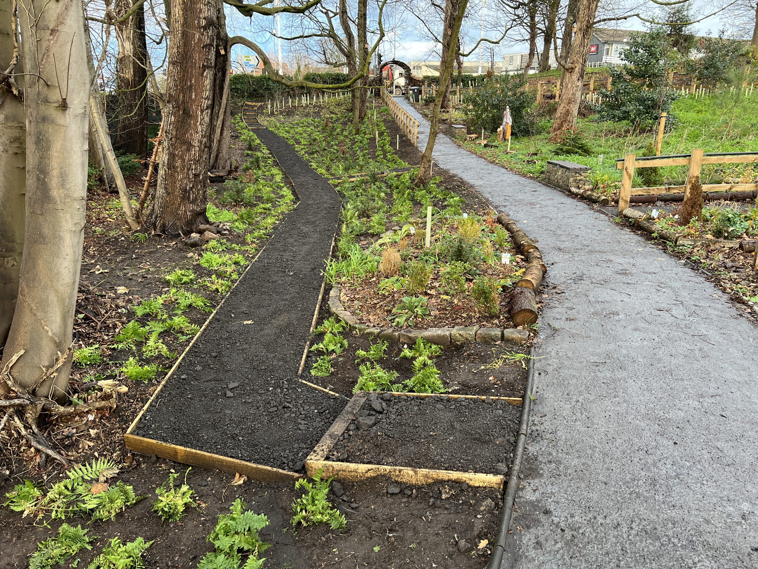 Take A Walk….. The newly installed crowdfunded pathway starts at the Rowlands Dell entrance adjacent to the beautifully refurbished Hare & Hounds PH, with two entrance points descending on long steps, inviting the walker into the first of four distinct nature areas comprising of a developing lush woodland fernery of 600 newly planted ferns (seven