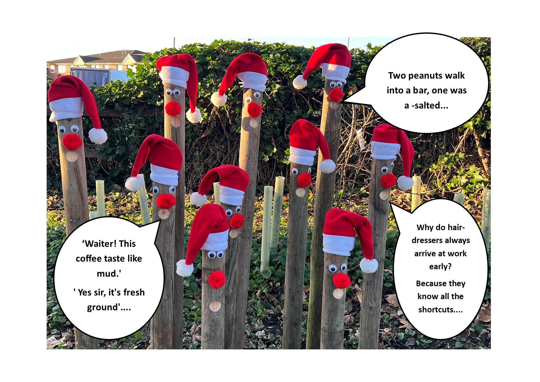 Please laminate your jokes and using the provided pegs, please attach them onto the washing line hanging from the fence handrail, in front of our North Pole Santa’s (pictured close to the log archway) at our Rowlands Dell Project, to spread some Christmas cheer. Many thanks. To finish this beautiful transformative haven, we are