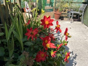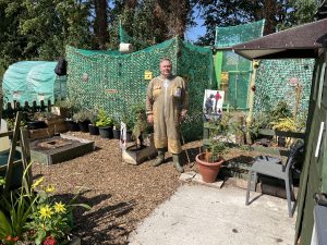 On arrival, I was greeted by Karl and could instantly see many of his virtues echoed in the allotment with a calm, open, organised, welcoming environment. In front of the netted apiary a small tidy shed had been erected for storage and decorated with some army motifs. A beautiful flower area with seating around a focal water fountain, close to a bee water station.