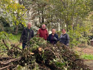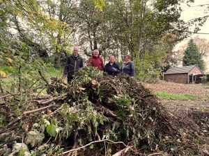 Many thanks to john, Paul, Chris (b) and Joanne Next to a mountain of twigs and branches that will form small wildlife habitats, once the Ivy and litter have been cleared.