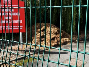 This Wednesday at 11.00 hrs our one hour initiative is focusing on further spreading of wood chippings around our new and healthy looking wildlife friendly hedge at the front of Hudson Primary School.