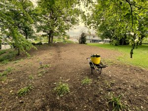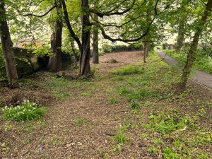 - Spreading donated woodchip on the cleared south slope, to re-establish the tree hydrating humus layer, and temporarily suppress dominant weeds, prior to a large woodland planting programme at the end of the year.