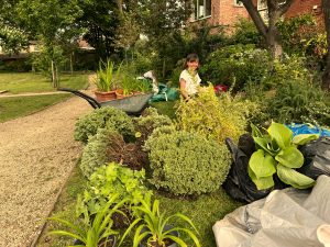- Removed one agricultural bags of weeds from the border and the two rockery’s and transplanted some small shrubs around the community kindness art installation rockery.