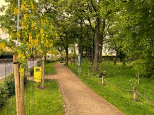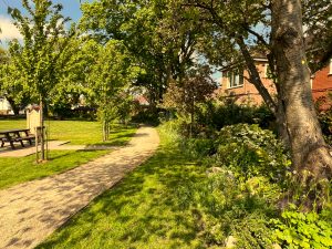 FOMD’s Newly planted laburnum tree Boulevard leading to the children’s nature corner resplendent with bug hotel, bulbs and wildflowers.
