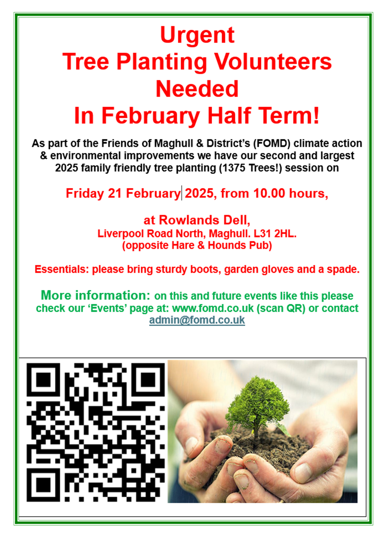 Urgent Tree Planting Volunteers Needed In February Half Term! As part of the Friends of Maghull & District’s (FOMD) climate action & environmental improvements we have our second and largest 2025 family friendly tree planting (1,248 Trees!) session on Friday 21 February 2025, from 10.00 hours, at Rowlands Dell, Liverpool Road North, Maghull. L31 […]