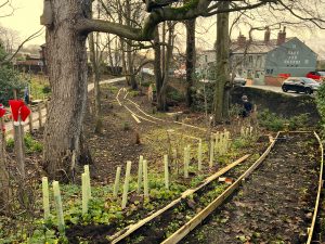 The newly installed crowdfunded pathway starts at the Rowlands Dell entrance adjacent to the beautifully refurbished Hare & Hounds PH, with two entrance points descending on long steps, inviting the walker into the first of four distinct nature areas comprising of a developing lush woodland fernery of 600 newly planted ferns (seven different species). As you walk through the fernery path it is bordered with newly planted ferns and daffodils, whilst on the left you will be greeted by the enchanting bug hotel and a developing compost area utilising the recycled fern pallets. Which is overlooked by a young grant funded wildlife friendly evergreen Yew Tree hedge enthusiastically growing to mask the historic sandstone quarry wall and will grow high enough to obscure the intrusion of neighbouring traffic. As you leave the fernery you will ascend on further long steps between the Ivy hedge and the Hawthorn hedge, reaching a viewing point height to overlook a planned sloping carpet of stunning wildlife friendly red berried (Red Cushion) pyracantha and the seasonal portrait of historic trees and woodland ferns.