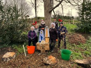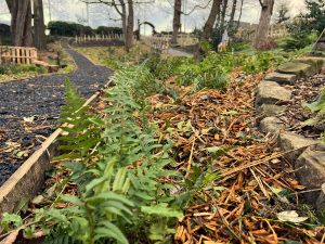 Secondly, we were astounded by the kindness and cheerful hard work of the volunteers on the (20.12.25) who moved countless tons of the donated woodchip. The challenge, apart from the huge amount we needed to move and the importance of moving it quickly before it started decomposing which can result in respiratory discomfort, was to rake and spade it into individual wheelbarrows and transport it from the high access point, down the sloping and winding paths to the lowest part of the Dell, then hand sprinkle woodchip delicately around 612 ferns (providing an attractive hydrating and weed suppressing mulch to maximise growth and survival), then repeating this countless times! (Pictured by nativity: Joan, Diane, Ian, Nikki, John, Graham and Colin & Frank not pictured)