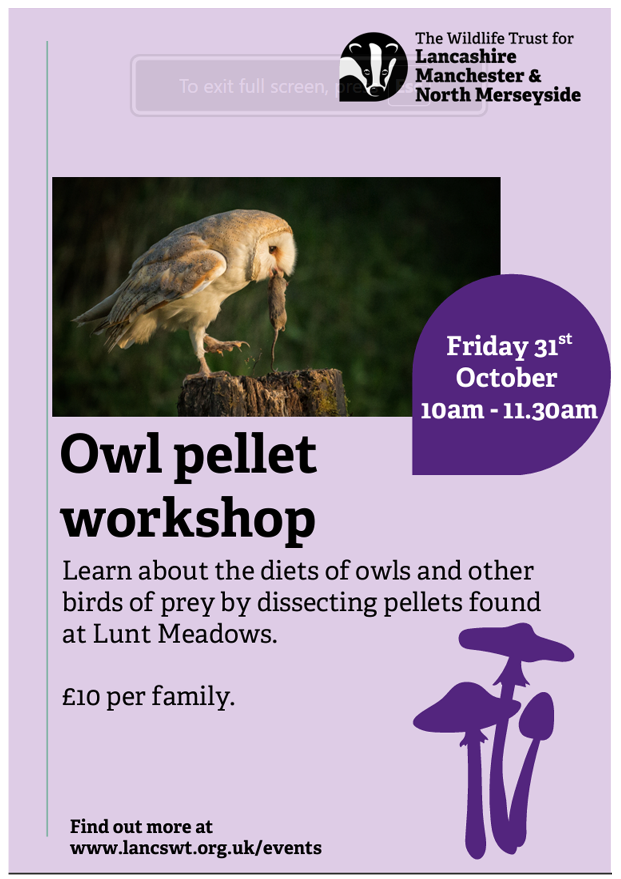 Nature Events on Maghull’s Doorstep: Owl Pellet Workshop, at Lunt Meadows (Friday 31.10.25).