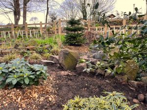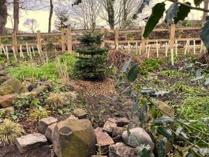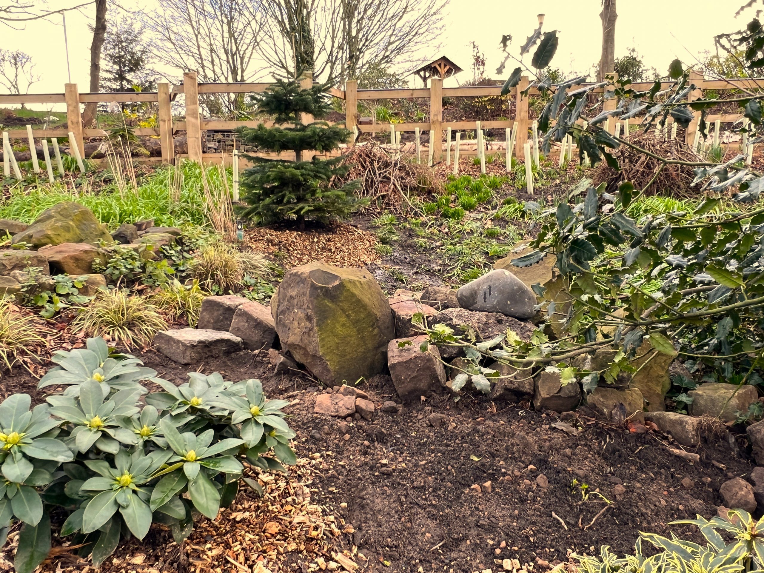 Pictured: the beautiful donated Nordman tree planted as a backdrop to the ongoing bog garden.