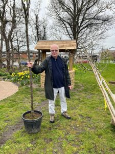 We would like to thank Cllr Dr Mike Desmond (pictured), colleagues and Green Sefton for their support and for working immensely hard to provide ten large standard trees, comprising of (1) five fruit trees completing the picnic/viewing/community orchard area and (2) five red birch trees completing the sunken garden area at your national award-winning Rowlands Dell NHS Health and Wellness Green Transformation Project.